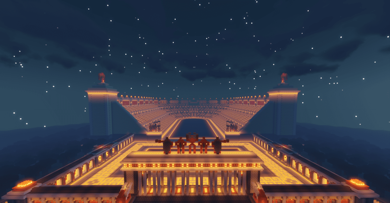 Карту легко представить оживлённым, трибуны полными зрителей, арену залитой светом факелов, а внутри кипят эмоции спортивных баталий. Пространства здесь достаточно, чтобы организовывать собственные состязания, проводить ролевые игры или даже использовать карту как декорацию для съёмки видео.