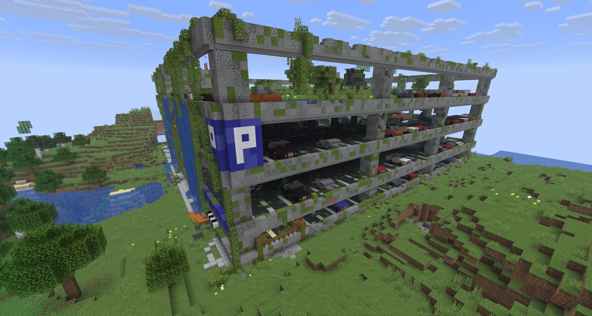 Big Lost City делает ставку не на уют и не на удобство, а на сильную атмосферу заброшенного мира. Мод добавляет современные разрушенные сооружения, которые генерируются естественным образом и создают ощущение давно исчезнувшей цивилизации. Хорошо работает контраст: знакомые по форме здания выглядят мертвыми, покинутыми и постепенно захваченными временем и природой.