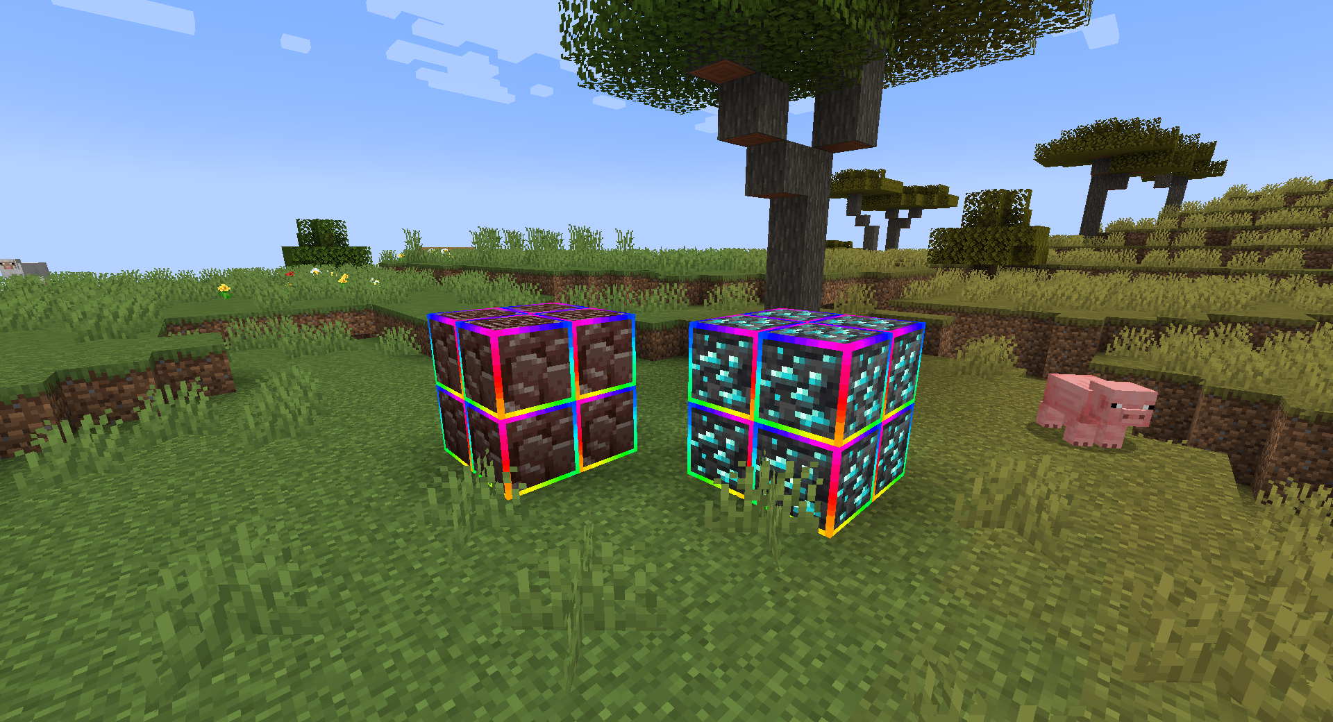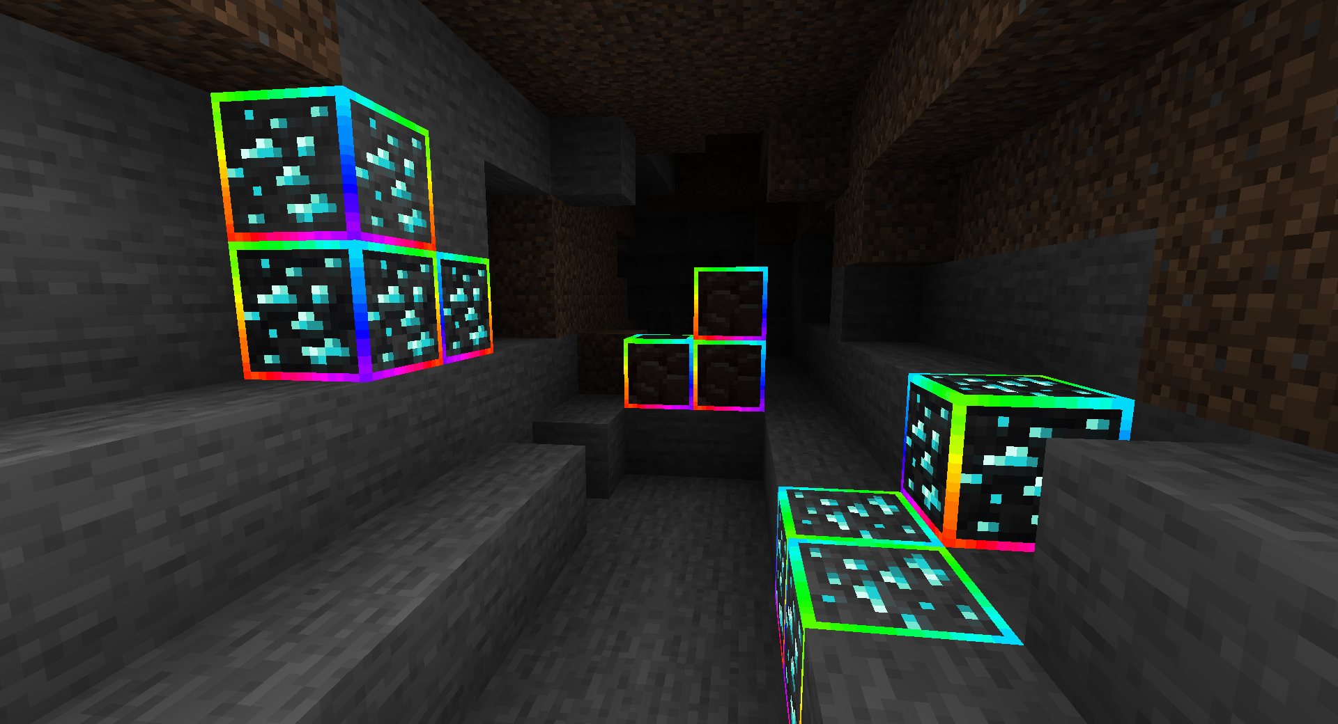 В темных пещерах Майнкрафта иногда бывает сложно заметить редкие ресурсы, особенно если они частично скрыты в стенах. Rainbow Diamond Ores & Ancient Debris решает эту проблему довольно простым, но эффектным способом. Алмазная руда и древние обломки получают яркую радужную подсветку по краям текстуры. Благодаря этому они сразу выделяются среди обычных блоков камня или незера.